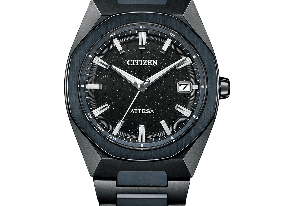 ベゼルとバンドの中駒にDLCブルーを採用。ラメを練り込んだブラックの文字板は、