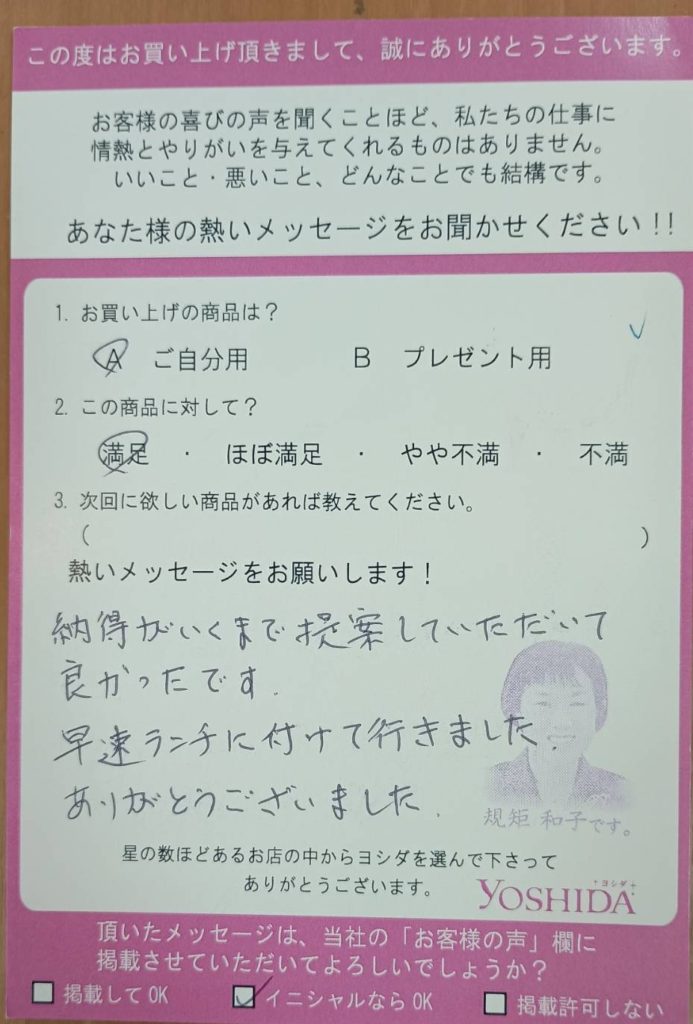 「納得がいくまで提案していただいて、良かったです。早速ランチに付けて行きました。ありがとうございました。」